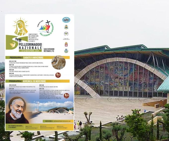 È in programma, a San Giovanni Rotondo, sabato 9 e domenica 10 novembre 2024 il pellegrinaggio nazionale delle Confraternite. Attraverso il motto “Pellegrini di speranza” rappresenta il cammino in preparazione del Giubileo 2025; in due giornate, ricche di significato spirituale e iniziative di natura religiosa, la città di San Pio si prepara ad accogliere i numerosi membri delle Confraternite che parteciperanno a questo eccezionale evento. Il pellegrinaggio è organizzato dalla Confederazione delle Confraternite, dal Comune di San Giovanni Rotondo, dalla Regione Puglia, dai Frati Cappuccini del Santuario di San Pio, dalla diocesi di Vieste-Manfredonia- San Giovanni Rotondo.