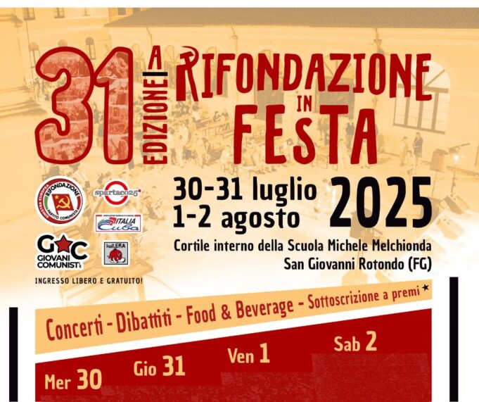«Rifondazione in Festa non è solo un evento di partito, ma la storia di una comunità, di un collettivo che crede che un altro mondo è possibile, che un altro modo di fare politica è necessario. Un gruppo che si incontra, discute, si organizza e resiste da 31 anni. Rifondazione in Festa nasce dal lavoro militante e gratuito di decine di compagne e compagni che si rimboccano le maniche e rendono possibile ciò che per altri è impensabile: costruire uno spazio libero, popolare, politico e totalmente autofinanziato a San Giovanni Rotondo. — Dichiara Roberto Cappucci, consigliere comunale e segretario cittadino del PRC.