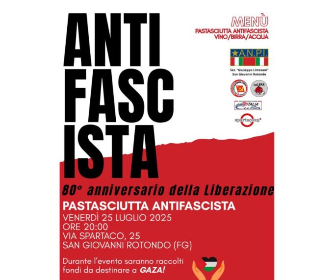 A San Giovanni Rotondo, anche quest’anno, la Pastasciutta Antifascista torna per il suo tradizionale appuntamento. L’evento si terrà venerdì 25 luglio, in via Spartaco 25, alle ore 20:00. Un momento conviviale e popolare per ricordare con semplicità e forza il crollo del regime fascista e la speranza che si riaccese nel Paese nel luglio del 1943.