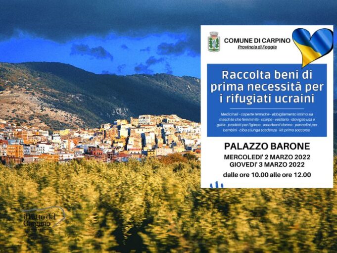 In collaborazione con i giovani volontari resesi disponibili, l’amministrazione comunale di Carpino, ha attivato un centro di raccolta per generi di prima necessità non deperibili e medicinali da donare in aiuto al popolo ucraino che sta giungendo in Italia e anche nella provincia di Foggia.