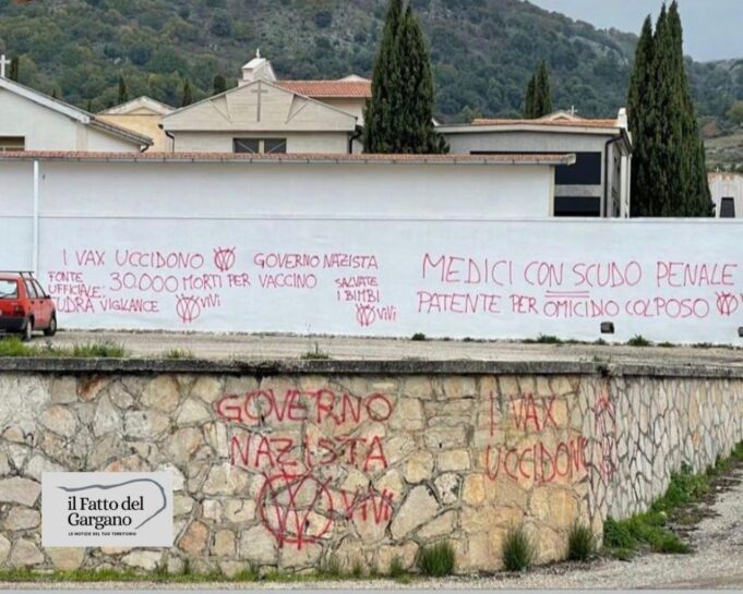 “Governo Nazista”, “I Vax uccidono” e ancora la firma Vivi. Sono tornate questa mattina alcune scritte sui muri del cimitero di San Giovanni Rotondo, era accaduto già il 5 novembre.