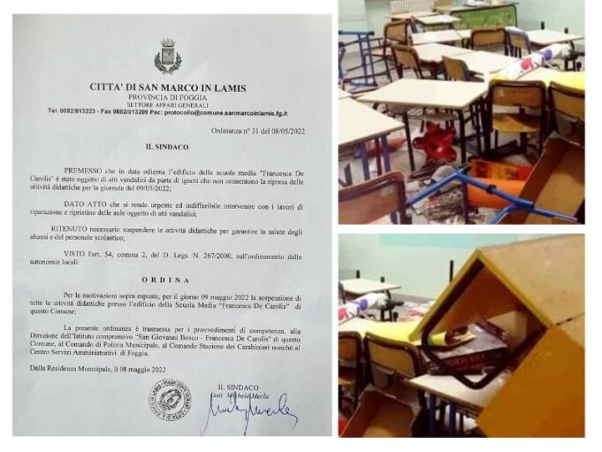 I carabinieri, che indagano sull’accaduto, sarebbero sulle tracce dei responsabili- secondo il quotidiano on line Gazzetta del sud- si tratterebbe di adolescenti. Sul posto, per la conta dei danni e i rilievi, oltre ai militari, sono intervenuti il sindaco, l’assessore alla Cultura, gli operatori scolastici e la protezione civile. Per i lavori di riparazione e ripristino delle aule, per garantire la salute degli alunni e del personale scolastico, il sindaco, Michele Merla, ha ordinato la sospensione delle attività didattiche per la giornata di oggi.