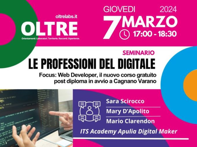 Il seminario, che si svolgerà nello Spazio Sportello OLTRE di Cagnano Varano, in Piazzetta Bellavista, è incentrato su “Le professioni del digitale”, con un focus sul Web Developer, il nuovo corso gratuito post-diploma in avvio a Cagnano Varano.