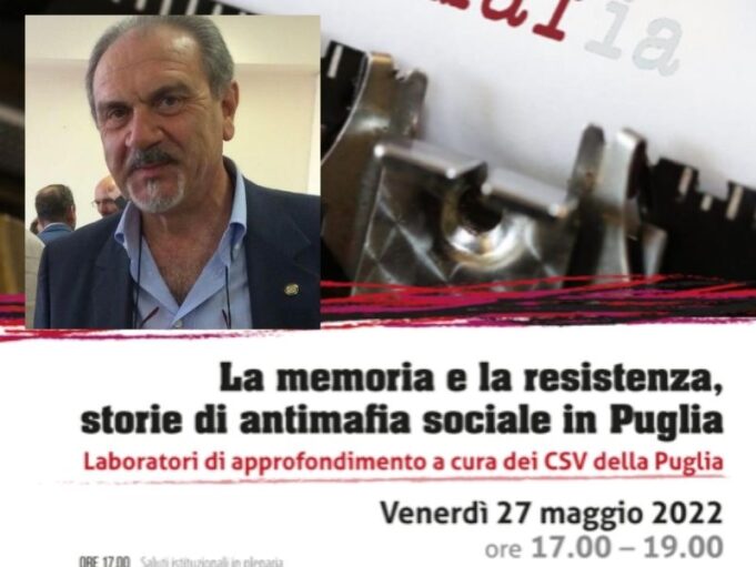 Venerdì 27 maggio 2022, dalle ore 17.00 alle 19.00 su piattaforma Zoom, i CSV della Puglia organizzano l’incontro “La memoria e la resistenza, storie di antimafia sociale in Puglia”.