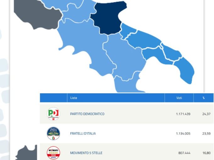 In provincia di Foggia il primo partito è il M5s, segue Fdi e Pd, il più votato in tutto il sud è il sindaco di Bari Antonio De Caro.
