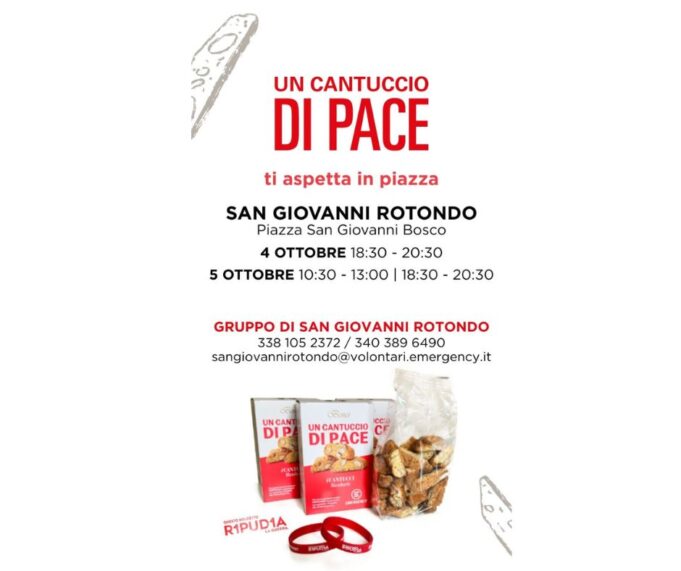 Per celebrare la Giornata del Dono, il 4 e il 5 ottobre EMERGENCY sarà a San Giovanni Rotondo, Foggia e Monte Sant’Angelo con “Un Cantuccio di Pace”: oltre 2.000 i volontari saranno in 20 regioni italiane con i tipici biscotti nostrani per un gesto di solidarietà in sostegno dell’ONG nel suo impegno medico sul fronte di Gaza.