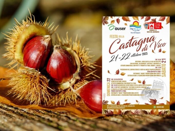 Due giorni di sapori, musica, visite guidate e menù dedicati: sabato 21 e domenica 22 ottobre 2023, si celebrerà la “Festa della Castagna di Vico”. L’evento prenderà il via sabato 21 ottobre, alle ore 16, in Largo Castello/via San Giuseppe con la degustazione di caldarroste, vin brulè e vino novello. Si potranno degustare piatti e prodotti a base di castagne e le tipicità di Vico del Gargano.
