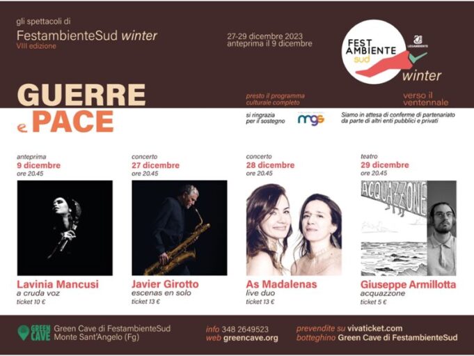 Dal 27 al 29 dicembre, nel centro culturale Green Cave di Legambiente a Monte Sant’Angelo, torna FestambienteSud winter, alla sua VIII edizione. Titolo della rassegna “Guerre e Pace”, a spiegarne il motivo sono gli organizzatori “Ci è sembrato necessario porre l’attenzione su quanto sta accadendo nel mondo. La nostra idea è che mentre il silenzio accompagna la guerra, la parola, l’arte e l’incontro costruiscono pace”.