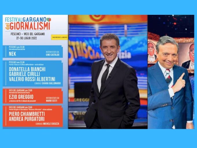 Venerdì 29 luglio, il Festival approderà a Vico del Gargano dove Ezio Greggio, dalle ore 21, sarà protagonista della serata e dialogherà con Mario Sesti. Prevista anche la proiezione del film “Il silenzio dei prosciutti”. Sabato 30 luglio, per il Premio Gargano di Giornalismo Vincenzo Afferrante, sul palco ci saranno Michele Cucuzza, Piero Chiambretti e Andrea Purgatori.