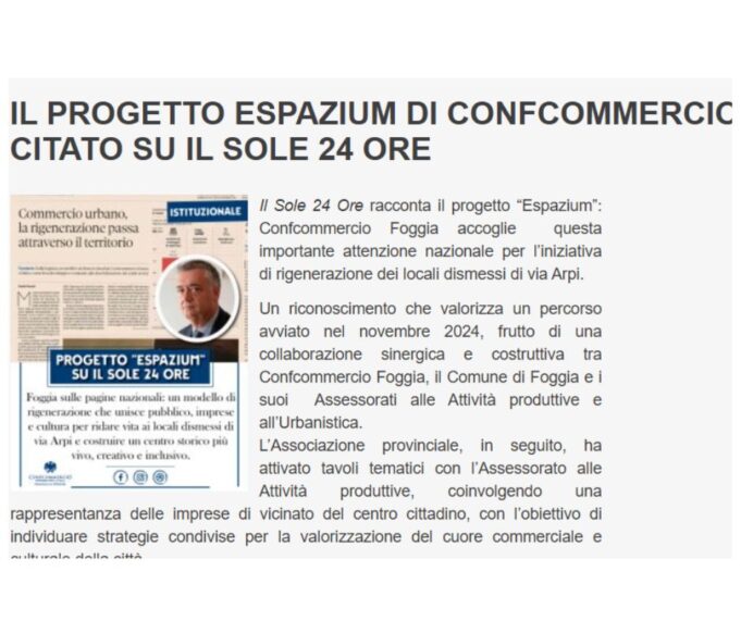 Confcommercio Foggia accoglie con orgoglio l’attenzione del quotidiano economico per il progetto che restituisce vita e funzioni ai locali dismessi di via Arpi.
