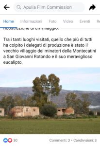 “Sono tante le richieste di location scouting che riceviamo ogni giorno e, la scorsa settimana, una produzione internazionale ci ha chiesto di individuare uno spazio dove effettuare la ricostruzione di un villaggio- si legge nel post. Tra i tanti luoghi visitati, quello che più di tutti ha colpito i delegati di produzione è stato il vecchio villaggio dei minatori della Montecatini a San Giovanni Rotondo e il suo meraviglioso eucalipto”.
