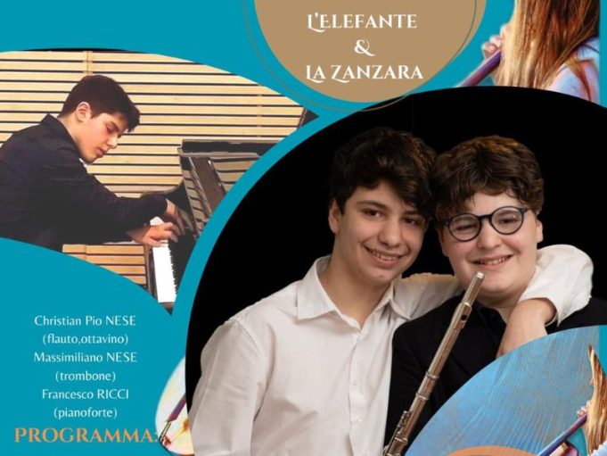 Ad avere pertanto l’onore di ospitare il quinto appuntamento in programma sarà il Teatro del Giannone di San Marco in Lamis, il cui palcoscenico sarà calcato da due autentici enfant prodige della musica classica: Christian Pio Nese al flauto e ottavino e Massimiliano Nese al trombone, accompagnati da Francesco Ricci al pianoforte. I tre talenti eseguiranno il programma “L’elefante e la Zanzara”.