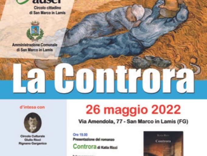 Continuano i libroforum promossi ed organizzati dal Circolo Auser di San Marco in Lamis. Questa volta l’appuntamento tocca a “Controra“, romanzo autobiografico di Katia Ricci, già docente nel settore al Liceo Classico di Foggia ed ora rinomata critica d’arte e scrittrice.
