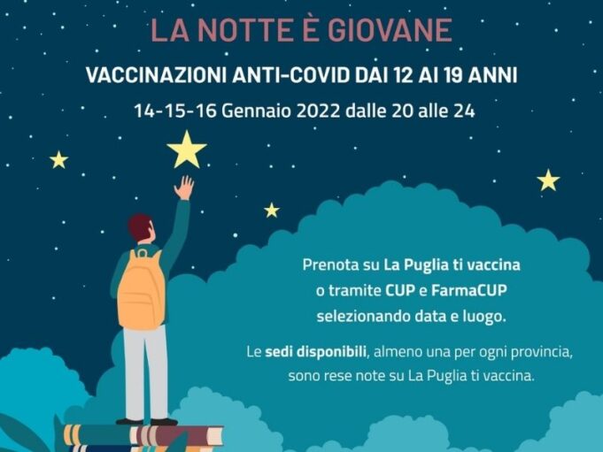 Lo dichiara il presidente della Regione Puglia Michele Emiliano nell’annunciare l’iniziativa regionale “La notte è giovane”, tre notti dedicate alla vaccinazione dei pugliesi di 12-19 anni, in programma il 14-15-16 gennaio, dalle ore 20 alle 24, nei principali hub vaccinali della regione.