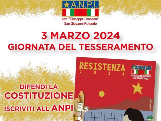 Domenica prossima, 3 marzo, a partire dalla ore 10:30, il circolo ANPI dedicato a Giuseppe Limosani, di San Giovanni Rotondo, sarà in piazza San Giovanni Bosco per la festa del tesseramento 2024.