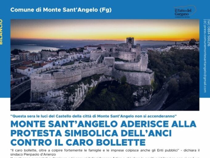 “Il caro bollette, oltre a colpire fortemente le famiglie e le imprese colpisce anche gli Enti pubblici” – dichiara il sindaco Pierpaolo d’Arienzo, che annuncia – “Questa sera le luci del castello della città di Monte Sant’Angelo non si accenderanno. Abbiamo scelto il nostro imponente castello come luogo simbolo della protesta per il caro bollette, promossa da Antonio Decaro, sindaco di Bari e presidente ANCI”.