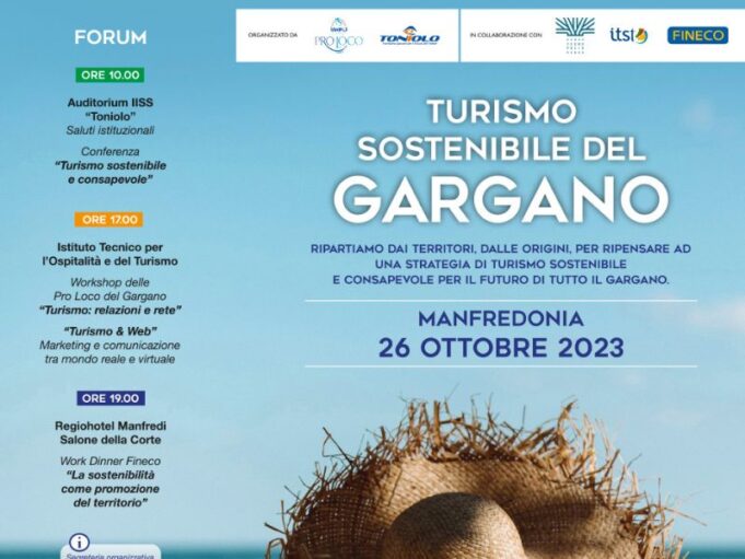 Si confronteranno esperti e operatori del settore turistico, studenti e docenti, nel forum “Turismo sostenibile del Gargano”, organizzato dalle Pro Loco del Gargano unitamente all’IISS Toniolo e ITST Manfredonia, con la collaborazione di Tecnopolis Bari e Fineco. L’atteso appuntamento è per giovedì 26 ottobre a partire dalle ore 10:00 presso l’auditorium dell’IISS “G. Toniolo” e si aprirà con i saluti istituzionali del Dirigente, prof. Pellegrino Iannelli, e la presentazione della giornalista Annamaria Vitulano. I lavori verranno introdotti dai promotori dell’iniziativa, il presidente della Pro Loco Vieste, dott. Nicola Ragno, dal responsabile sistema turistico del Gargano (Progetto Proloco) on. Antonio Tasso, e dal direttore dell’ITST Manfredonia, dott. Matteo Robustella.