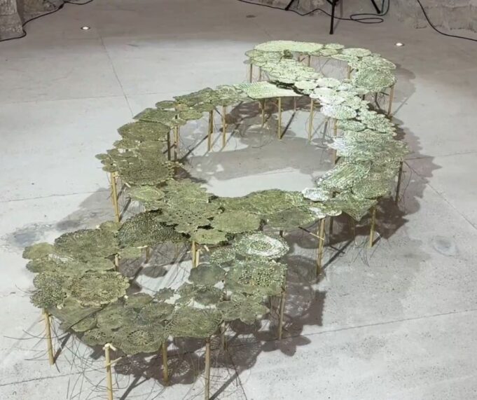 Con la forma del Terzo Paradiso di Pistoletto, l’installazione trasforma la tradizione tessile pugliese in una scultura eterna: pizzi e merletti donati dalle artigiane locali o provenienti da antichi corredi nuziali sono stati metallizzati con una innovativa tecnologia sviluppata dall’azienda Materica, che riveste materiali delicati con metalli come ottone, rame, bronzo e zinco, preservandone la struttura e proiettandoli nel futuro. Un’opera che fonde memoria e innovazione, arte e tecnologia, tradizione e visione contemporanea, diventando un potente simbolo di identità e rinascita.