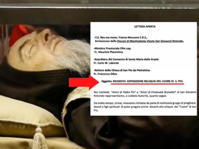 «Da molto tempo, ormai, riceviamo richieste da parte di moltissimi gruppi di preghiera, devoti e figli spirituali di poter pregare anche davanti alla reliquia del “Cuore” di San Pio». Inizia così la lettera inviata a mons. Franco Moscone, al Ministro Provinciale dei frati cappuccini, Fr. Maurizio Placentino, al Guardiano del Convento di San Giovanni Rotondo, Fr. Carlo M. Laborde, e al rettore della Chiesa di San Pio, Fr. Francesco Dileo. La lettera (in foto copertina) è stata inviata pochi giorni prima della Festa di San Pio, esattamente il 17 settembre, a firma del presidente del comitato “Amici di Padre Pio”, Costanzo Bocci e dal presidente del comitato “Amici di Emanuele Brunatto”, Raffaele Augello.