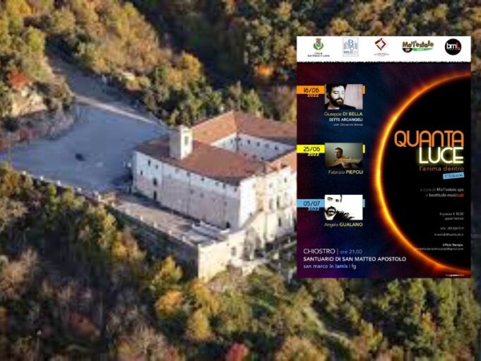 Saranno tre gli eventi musicali che animeranno la prima edizione di Quanta Luce, la rassegna a cura di Mo’l’estate Spirit Festival e Beatitudo Music Lab. La mini kermesse, sottotitolata “l’anima dentro”, si svolgerà proprio all’interno del chiostro del suggestivo Santuario di San Matteo Apostolo, a San Marco in Lamis, fondato dai Benedettini fra il IX e X secolo, uno dei pochi complessi monastici della Capitanata ininterrottamente abitati da famiglie religiose per tutta la loro lunga storia.