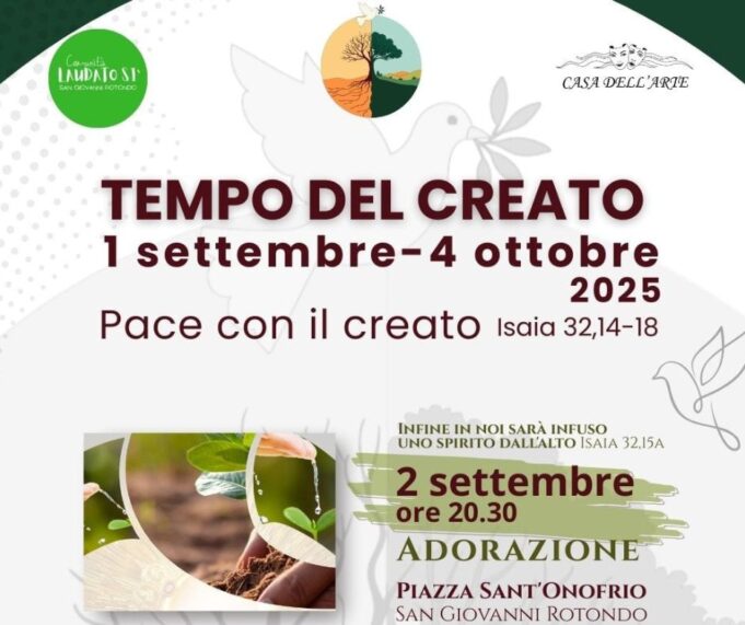 A San Giovanni Rotondo, martedì 2 settembre, alle ore 20.30, presso il piazzale della chiesa di Sant’Onofrio, si terrà l’adorazione eucaristica. Il momento di preghiera sarà presieduto da S.E.R. Mons. padre Franco Moscone, arcivescovo della diocesi di Manfredonia-Vieste-San Giovanni Rotondo, con la partecipazione di don Pasquale Paloscia, assistente spirituale della comunità Laudato si’. Venerdì 5 settembre, ore 21.00, a Mattinata, presso la “Casa dell’Arte”, avrà luogo la quarta edizione del concerto “Una voce per il Creato”. La kermesse musicale è organizzata in collaborazione con l’associazione “Dare”. Nel corso della serata a ingresso libero, alcuni giovani artisti del territorio si esibiranno sulle note di grandi classici della musica italiana e internazionale, proponendo brani con temi di pace, cura e fraternità e alternati dalle coreografie interpretate dai giovani e giovanissimi allievi della “RDL Academy” di Mattinata i cui insegnanti sono artisti della compagnia teatrale RDL formata da Carlo Tedeschi.