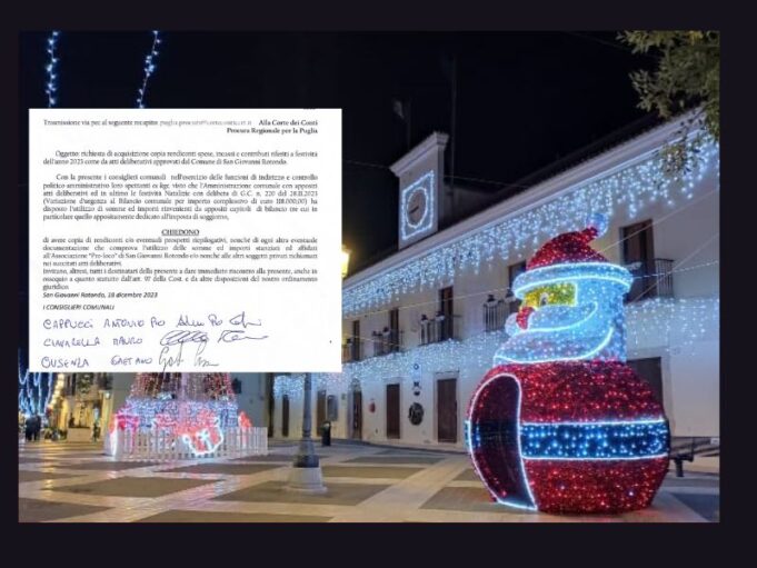 «La delibera di Giunta risale al 28 novembre, oggi ci chiedono in Consiglio una variazione di urgenza, cioè la Giunta si è posto l’obiettivo di organizzare gli eventi natalizi non avendo capienza nei fondi di bilancio e sono stati utilizzati altri capitoli come la tassa di soggiorno, l’indennità di missione ecc., il tutto per un importo di circa 126 mila euro- dichiara il consigliere Antonio Pio Cappucci. Noi siamo favorevoli ad organizzare eventi, sia chiaro, ma con questi altri 126 mila euro, che si aggiungono ai 380 già spesi, si arriva a circa 500 mila euro per tutte le feste nell’ultimo anno, ci sembrano cifre esagerate con cui avremmo potuto aiutare tante famiglie bisognose della nostra città. Inoltre come amministratori abbiamo l’obbligo morale di dire ai cittadini quanto è stato speso. Dal 12 aprile 2023, data da cui il sindaco Michele Crisetti si è reso promotore del nuovo accordo politico, questa nuova maggioranza ha disposto l’utilizzo di contributi per eventi, spettacoli e con questi per il Natale, arriviamo appunto a 500 mila euro, a partire dai 145 mila euro della festa patronale, spesi in tre giorni,100 mila euro per l’estate sangiovannese, 50 mila euro per la festa di Santa Maria delle Grazie, 10.000 euro per il concerto della banda della Polizia di Stato, ecc.- elenca Cappucci. Oltre al problema di queste spese pazze esiste anche un problema di metodo: l’amministrazione sceglie alcune associazioni per far organizzare gli eventi, cioè rendono le associazioni promotrici e responsabili dell’evento. Ci è giunta segnalazione che queste associazioni che organizzano gli eventi ricevono contributi vari, noi vogliamo sapere quanti soldi ricevono dai privati e in che modo coesistono con i finanziamenti che ricevono dall’amministrazione, visto che non ho ricevuto risposte abbiamo protocollato una nota in cui chiediamo al sindaco, al segretario comunale e la inviamo alla Corte dei Conti (in foto), in cui chiediamo una rendicontazione puntuale delle spese, degli incassi, dei contributi riferiti a tutte le manifestazioni organizzate in questo 2023, vogliamo sapere anche eventuali entrate in forme di sponsor». Conclude Cappucci.