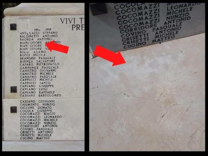 «Stamattina mi arrivano queste foto, telefonate, resto sgomento- spiega il sindaco Crisetti denunciando l’ accaduto sulla sua pagina social- ma com’è possibile? Mi chiedo. Com’è possibile che siano venute via così delle lettere e alcuni nomi dei nostri caduti siano stati deturpati in questo modo? Com’è possibile che il marmo sia così eroso e corroso? La risposta: Qualcuno ha appositamente agito per sfregiare l’opera, buttando una sostanza corrosiva sull’opera. Qualcuno ha agito coscientemente per oscurare la memoria dei nostri cari, dei nostri concittadini che hanno dato la vita per la Patria. Vergogna- aggiunge Crisetti– Dire che sono disgustato, profondamente arrabbiato e indignato non renderà neanche l’1% del mio stato d’animo attuale. Ma alla rabbia non seguirà rassegnazione. Assolutamente no. Sporgerò denuncia contro ignoti. Questo scempio non passerà sotto silenzio».