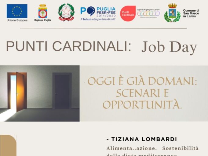 L’Assessorato alle Politiche, Attività e Servizi sociali, Paolo Soccio, informa che nell’ambito del progetto “Punti cardinali: punti di orientamento per la formazione e il lavoro”, dopo il successo dei primi tre Job Days in cui sono state coinvolte soprattutto le scuole superiori e medie, si terranno altri due interessanti iniziative aperte a tutti i cittadini: venerdì 13 ottobre dalle 14:00 alle 20:00, “Oggi è già domani: scenari e opportunità”, e lunedì 16 ottobre dalle 14:00 alle 20:00, “Agricoltura 4.0”.