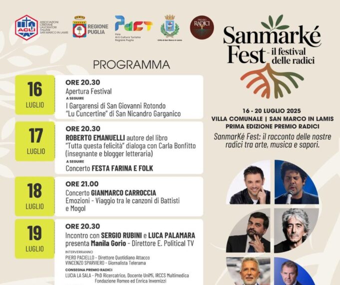 Tutto è pronto per SanMarkè Fest, il festival delle radici. Cinque giorni di incontri, musica, cultura, sapori e storie. Nel corso delle varie serate sarà consegnato il premio Radici a diverse personalità.