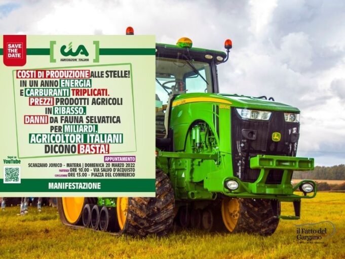 Manifestazione a Scanzano Jonico il 20 marzo, in Lucania arriveranno agricoltori da tutta la Puglia. CIA Agricoltori Italiani protesta contro i folli rialzi che stanno affossando il comparto primario.