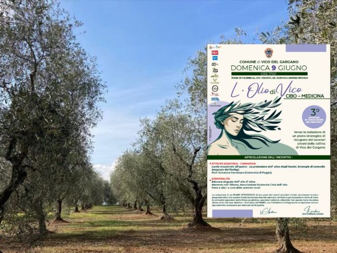 L’evento sarà ospitato dall’Azienda Agricola Andrea Piccolo. La Merenda nell’Oliveta è organizzata dall’Associazione Nazionale Città dell’Olio, di cui Vico del Gargano è parte integrante. Tra gli ulivi secolari, oltre alla merenda, si potrà partecipare a una Lectio Magistralis del professor Salvatore Germinale, dell’Università di Foggia, incentrata su “La protezione dell’ulivo dagli insetti: strategie di controllo integrato dei fitofagi”. Saranno degustati olii extravergini d’oliva e la squisita paposcia vichese.