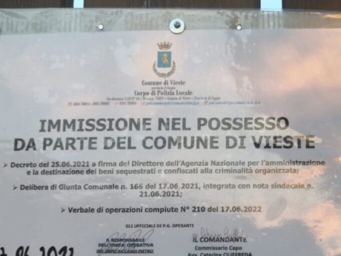 Ad eseguire il decreto di confisca sono stati gli agenti della Polizia Locale di Vieste, con a capo la comandante Caterina Ciuffreda. “Vieste è forse oggi ancora l’unico comune della Capitanata dove si continua ad eseguire questo tipo di provvedimenti. Il sindaco Nobiletti ha sin dall’inizio del suo mandato dichiarato guerra alla criminalità che a Vieste fino a qualche anno fa dettava legge. Oggi la città è cambiata e i residenti insieme ai tanti turisti percepiscono il senso di legalità, si sentono molto più sicuri. L’intervento effettuato ieri, in collaborazione con i Carabinieri, è un segnale forte al territorio”.